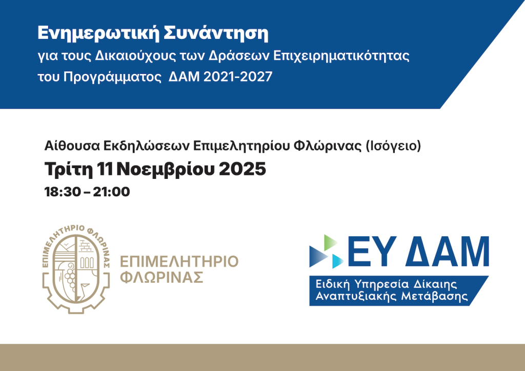 Το Επιμελητήριο Φλώρινας σας προσκαλεί στην Ενημερωτική Συνάντηση για τους Δικαιούχους των Δράσεων Επιχειρηματικότητας του Προγράμματος Δίκαιης Αναπτυξιακής Μετάβασης (ΔΑΜ) 2021-2027, που διοργανώνει η Ειδική Υπηρεσία Δίκαιης Αναπτυξιακής Μετάβασης (ΕΥΔΑΜ).